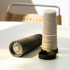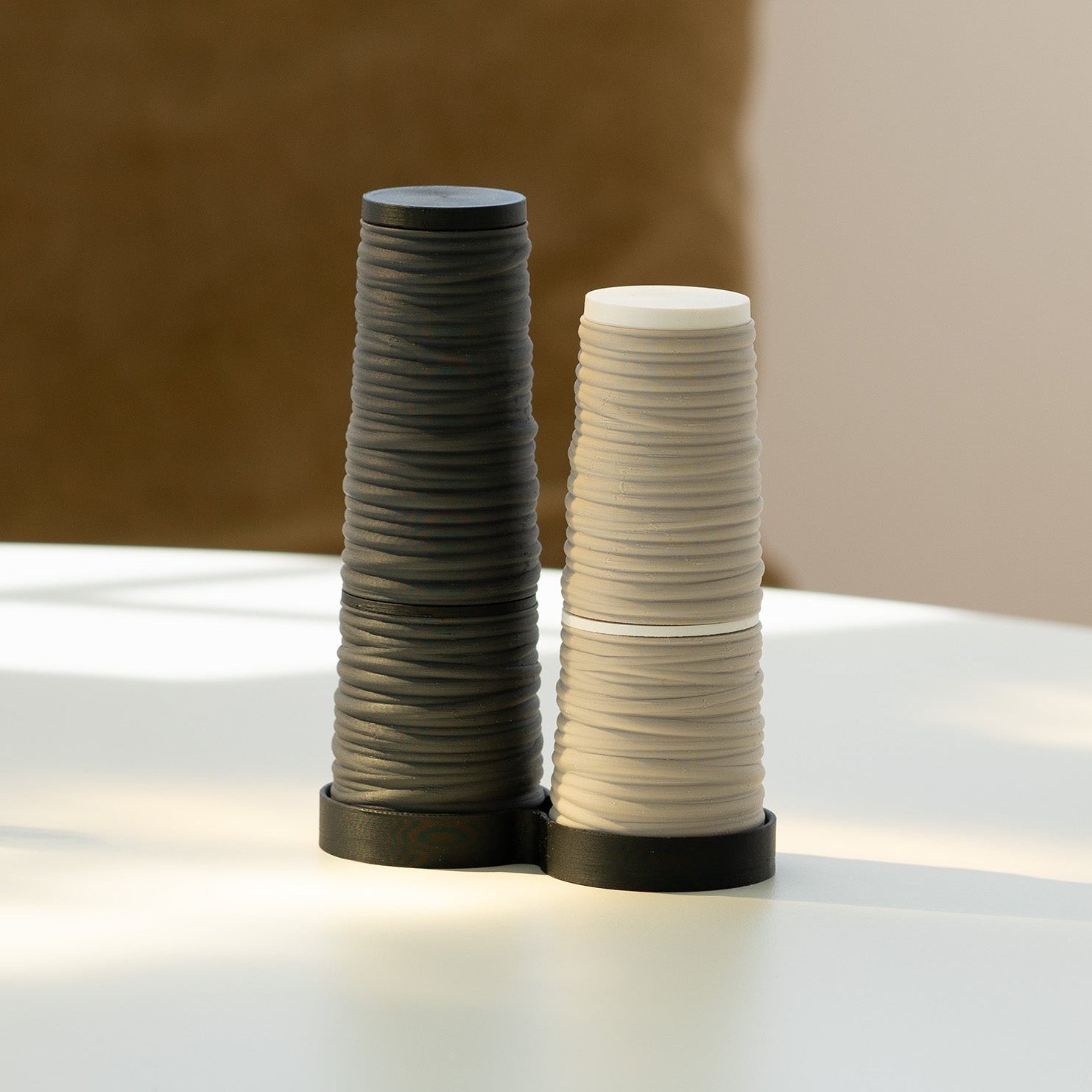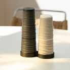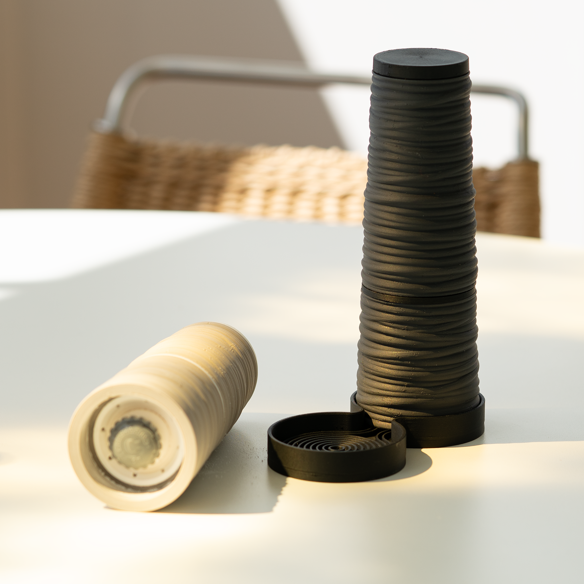 Nature has a way of combining structure with surprise. BAST conic grinder set takes its name from the raw inner fibers beneath the bark, a tangle of lines, robes and textures that hint at something handmade. The conic salt & pepper set carries that feeling into a sculptural everyday object. Clean, graphic, and just a little playful – ready to spark stories at the table.